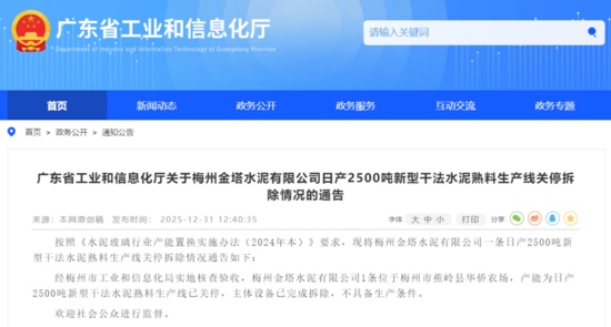 日前,广东省工业和信息化厅发布《关于梅州金塔水泥有限公司日产2500吨新型干法水泥熟料生产线关停拆除情况的通告》称,按照《水泥玻璃行业产能置换实施办法(2024年本)》要求,现将梅州金塔水泥有限公司一条日产2500吨新型干法水泥熟料生产线关停拆除情况通告如下: