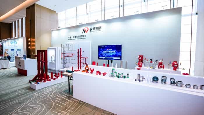 作为本次盛会的承办方之一,玫德集团不仅是会议的重要组织者,更以系统性、创新性的产品与技术展示,成为会场内外的焦点。在专题展示区,玫德集团集中呈现了在消防流体控制与系统集成方面的全链条产品矩阵。齿环卡压管件与碳钢卡压系统展现高密封性与抗震抗压能力;沟槽管件及卡压系统适用于复杂建筑结构与快速装配需求;喷淋头、预作用报警阀、雨淋阀、湿式报警阀、信号蝶阀等关键消防控制部件,体现玫德集团在自动灭火与智能预警方面的技术积累。