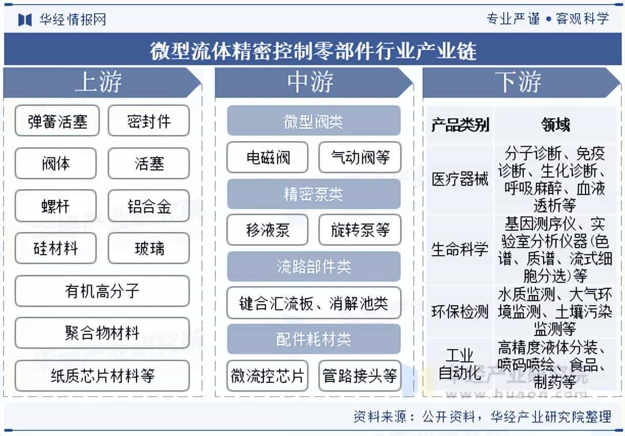 产业链中游为微流体控制零部件产业链中游为弹簧活塞、密封件、铝合金、硅材料、玻璃、纸质芯片材料等;产业链中游为微流体控制零部件厂商;产业链下游为医疗器械、生命科学、环保监测、工业自动化等领域的设备制造厂商。微型流体精密控制零部件产业链应用终端为相关设备,如医院、医疗检测机构、药械企业、环保监测站、水厂、科研院所等相关单位和企业。