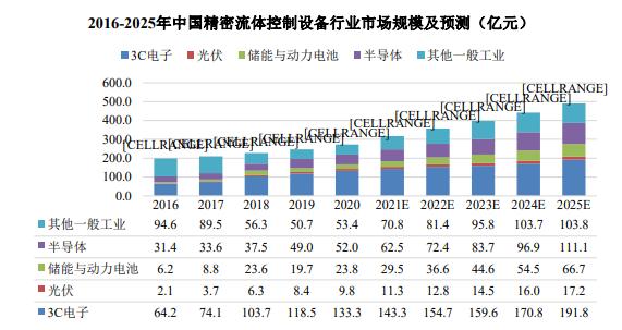 精密流体控制设备广泛应用于光伏、动力电池、储能电池、风电、氢能源、建筑、汽车工业等一般工业领域,以及消费电子、半导体等电子领域的点胶、涂覆、灌胶等胶接工艺,发展空间十分广阔。