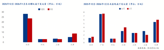从南下市场分布来看,1月东北钢厂螺纹计划投放区域主要集中在华北、华东,与上月投放地保持一致,区域投放比例无明显变化,其中华北由上月的91%上升至92%,而城市间变化加剧,北京投放量下降的量转移至了天津,北京占比下降约10%、天津占比则环比上升约9%。对比2025年1月情况来看,今年大区范围不变,依旧以华北、华东为主,但华北少了内蒙,华东少了山东、浙江,华北总占比上升一成、华东则下降超10%,即华北仍继续保持东北材的首选之地。而华北之内北京占比超60%,天津超20%,京津为主力阵营。